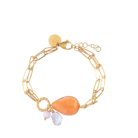Bracciale in lega senza nichel con galvanica in oro,Il bracciale con doppia catena a maglie rettangolari ha nella parte centrale una goccia di murano corallo con applicati cristalli a contrasto di colore